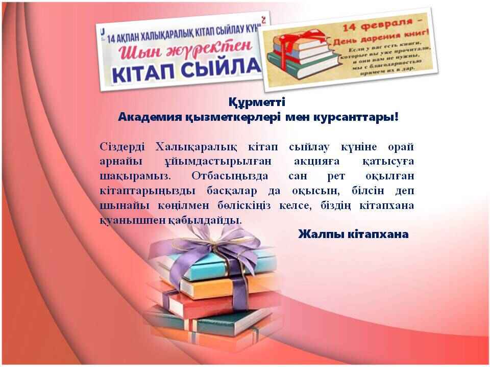Название: "14 - ақпан халықаралық кітап сыйлау күні " "14 - февраля - День дарения книг! "