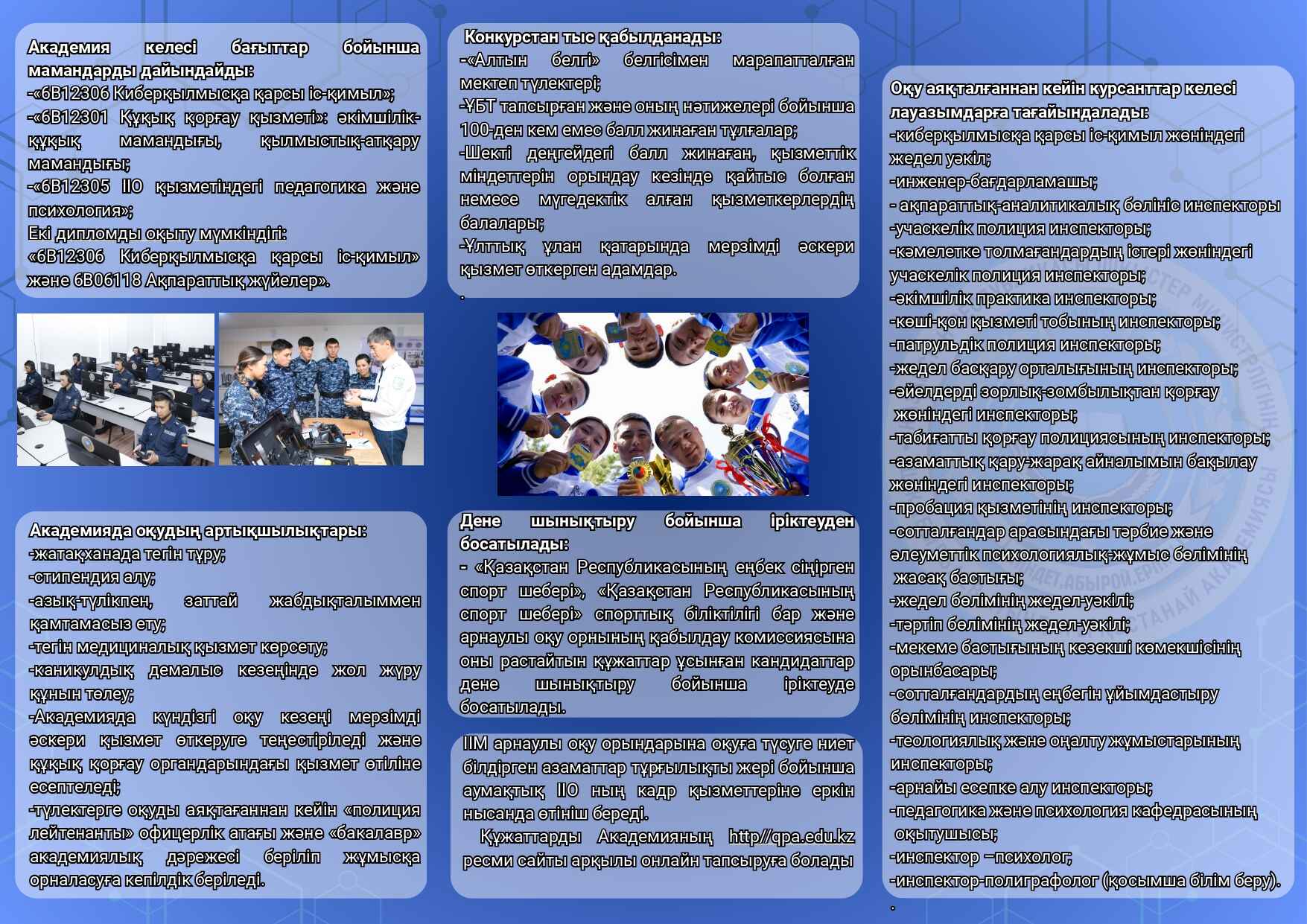 екі дипломды жоғары білім беру бағдарламасы «Киберқылмысқа қарсы іс-қимыл» және «Ақпараттық жүйелер» бойынша (бейіндік пәндер: математика, информатика).