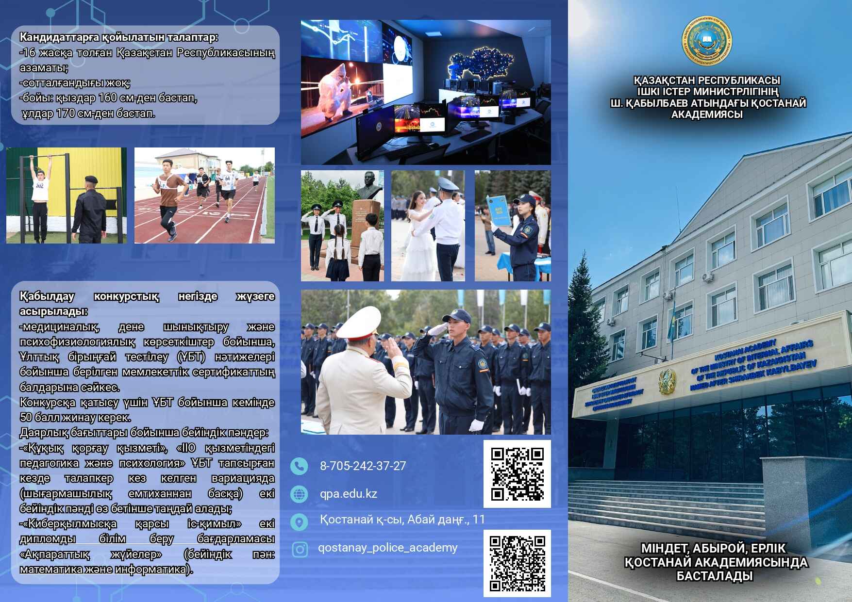 - Құжаттар қабылдау жылдың 15 шілдесіне дейін Қостанай академиясының сайтында (qpa.edu.kz) медициналық тексеруден өтуге жолдама алу және қажетті құжаттарды ресімдеу үшін «Бакалавриат» онлайн-қабылдау сілтемесі арқылы қабылданады.